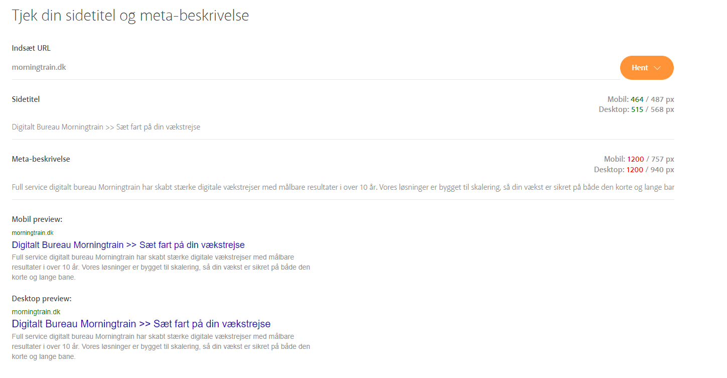 Den sidste del af femtrinsraketten har ikke så meget med page title og page description at gøre. Men sørg for at fylde så meget i Googles SERP som overhovedet muligt. Gør det nemmere for dig selv og brug vores meta checker.